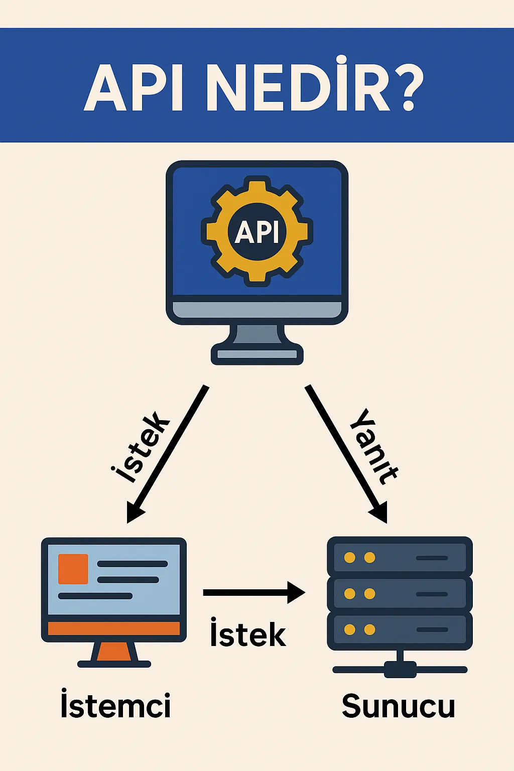 API (Application Programming Interface), Türkçede Uygulama Programlama Arayüzü anlamına gelir.